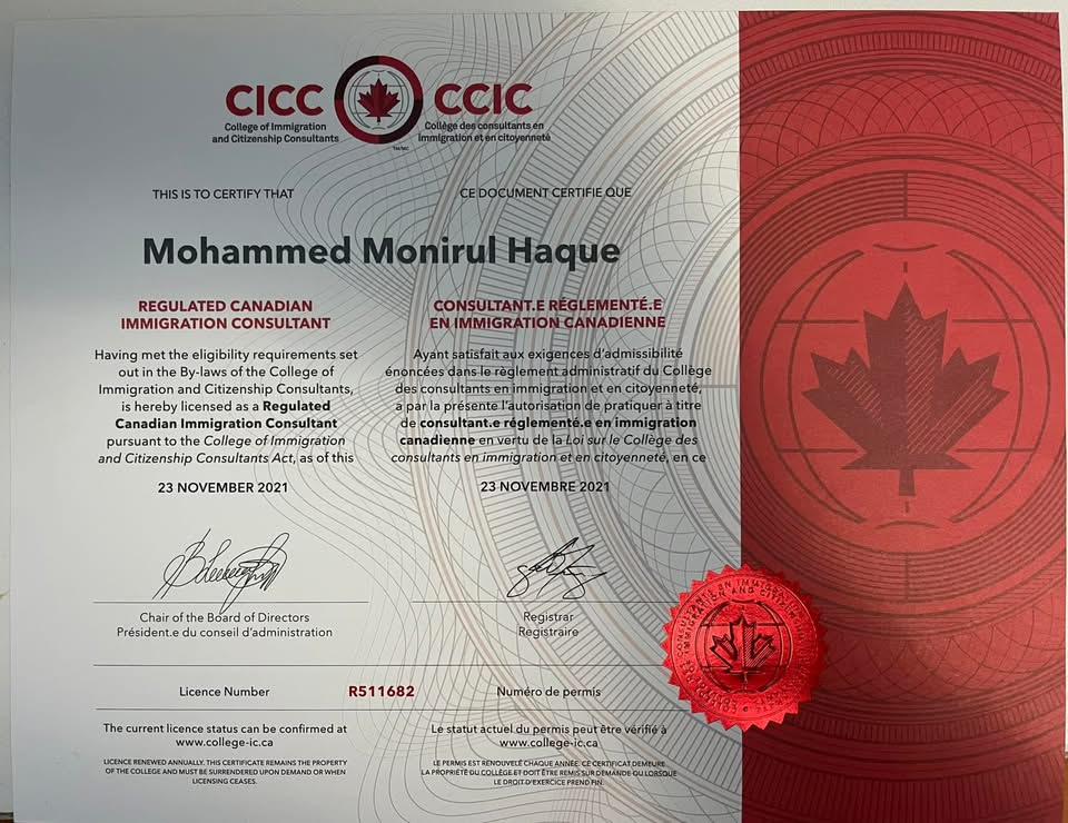 Mohammed Monirul Haque is the founder and CEO of Munir’s Education & Immigration Services and a licensed Regulated Canadian Immigration Consultant (RCIC). He obtained his RCIC license in 2013 and is fully registered with the College of Immigration and Citizenship Consultants (CCIC), maintaining good standing.